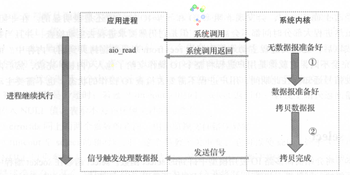 进程进行aio_read系统调用会立即返回,继续执行接下来的操作。内核会在所有I/O操作完成后给进程发送信号。对比信号驱动I/O,区别在内核发送信号的时机。