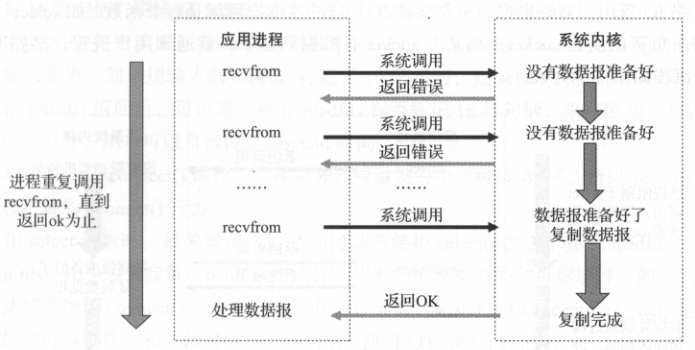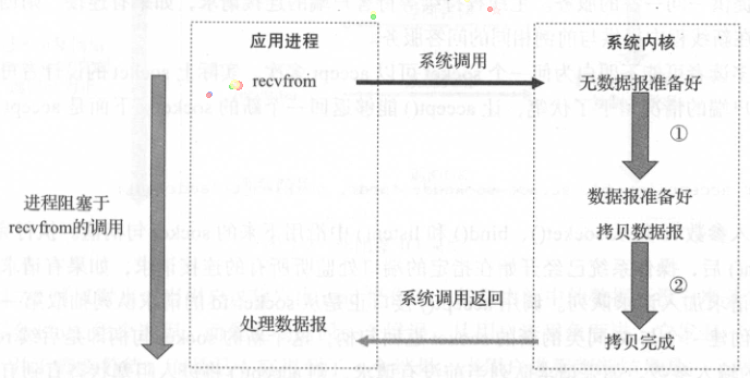 阻塞式I/O会导致应用进程阻塞,直至数据复制到应用进程缓冲区才返回去。应用进程调用recvfrom系统调用,在等待系统内核返回数据之前,应用进程保持阻塞状态,期间不能进行其他运算,直至数据返回。由于进程阻塞开销较大,简单改进方案是通过在服务器端采用多线程模式,线程所耗资源较小。